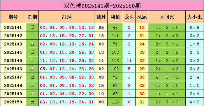 大小走势:近5期大小比为3:3、2:4、1:5、2:4、4:2,小数号码走势较热。历史上,前5次大小比4:2开出后,其下期大小比分别开出4:2、2:4、2:4、2:4、2:4,其中,大数号码出现12个,小数号码出现18个,小数号码走势较热。本期预计红球大小数号码平出,大小比参考3:3。