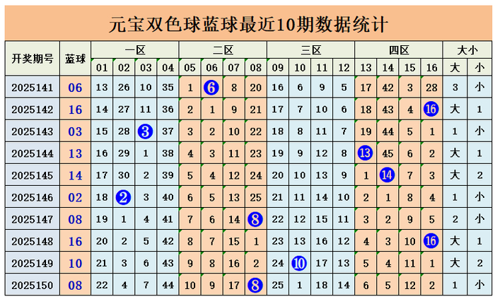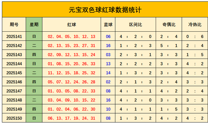 上期回顾:双色球第2025150期开出奖号:红球06、13、17、19、24、31;蓝球08,其中红球三区比为1:3:2,奇偶比4:2,蓝球开出小偶数号码08。